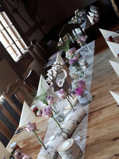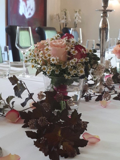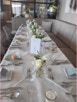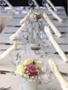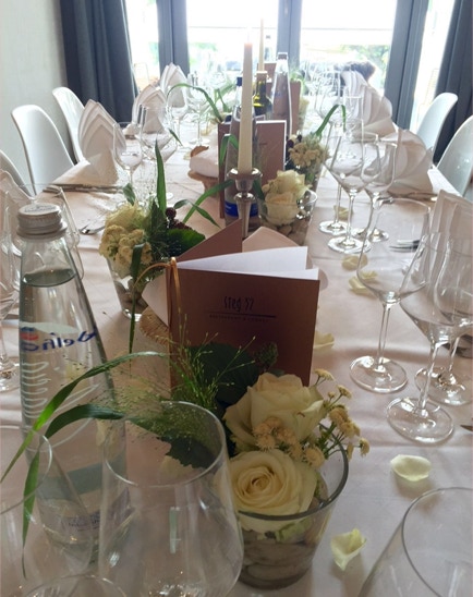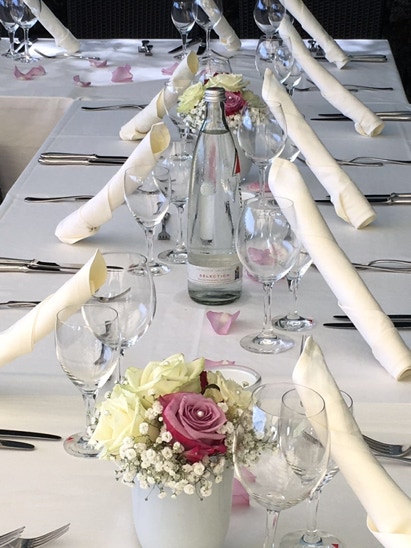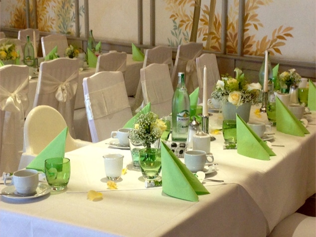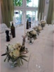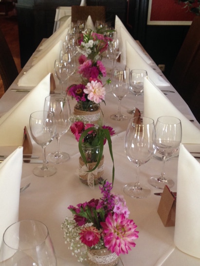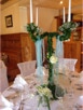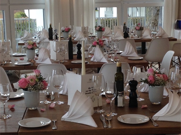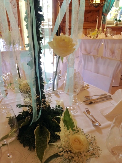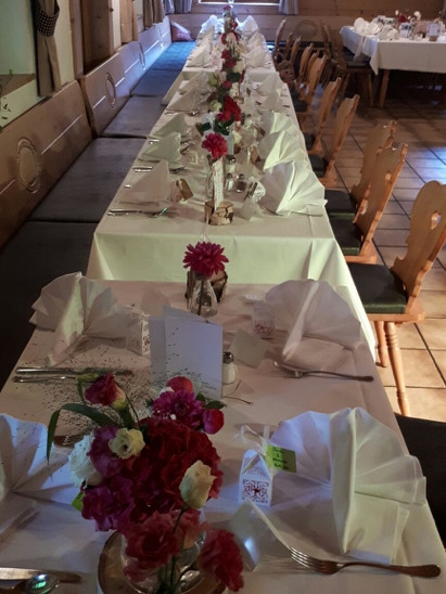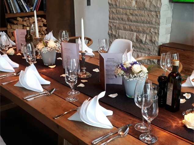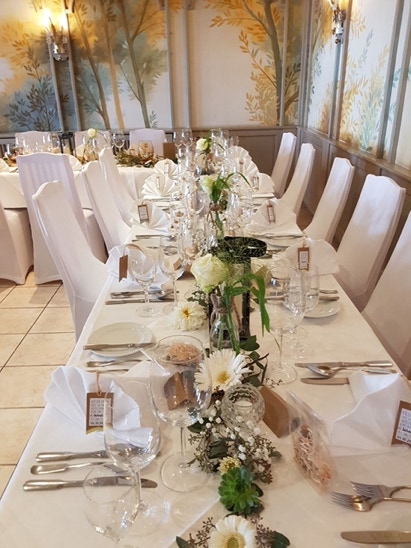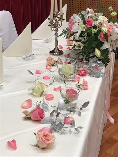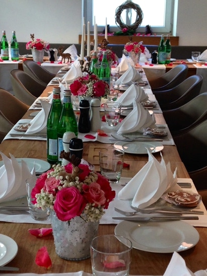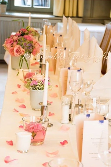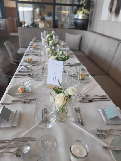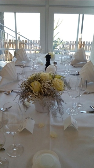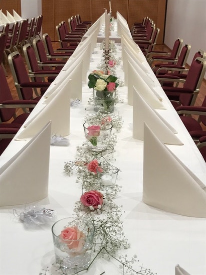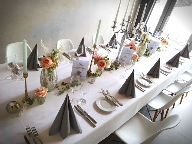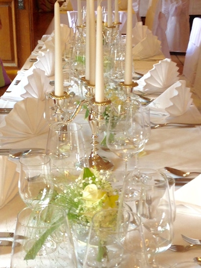 Bei einer länglichen Tafel bietet sich auch ein schmales und längliches Tischgesteck an.