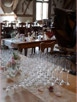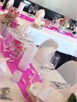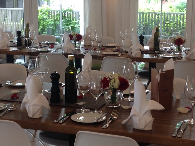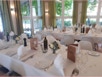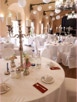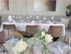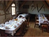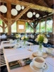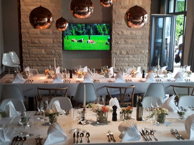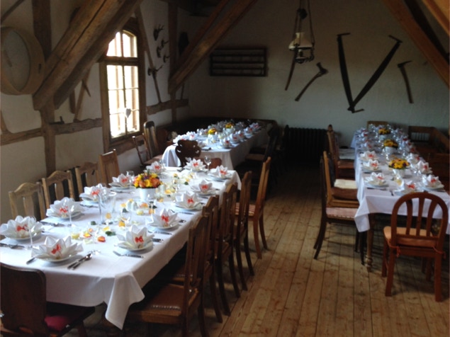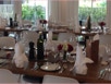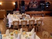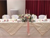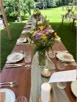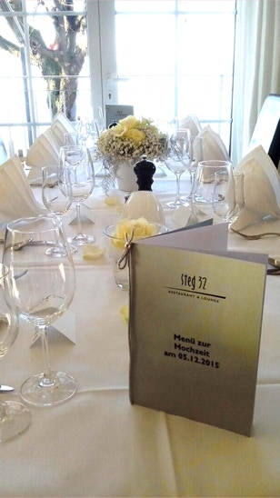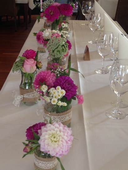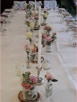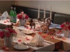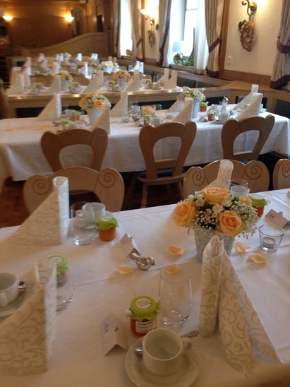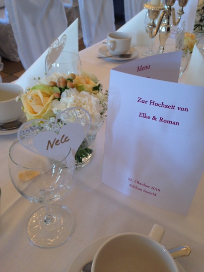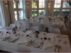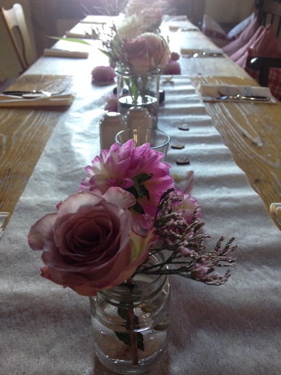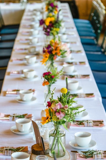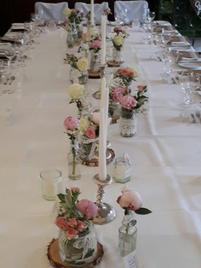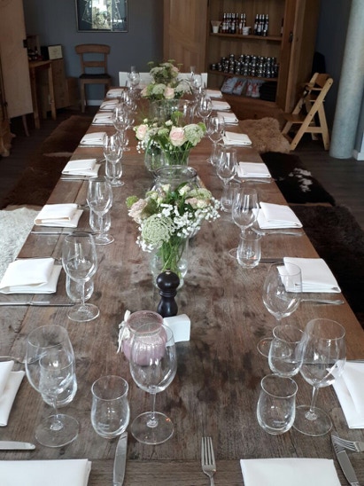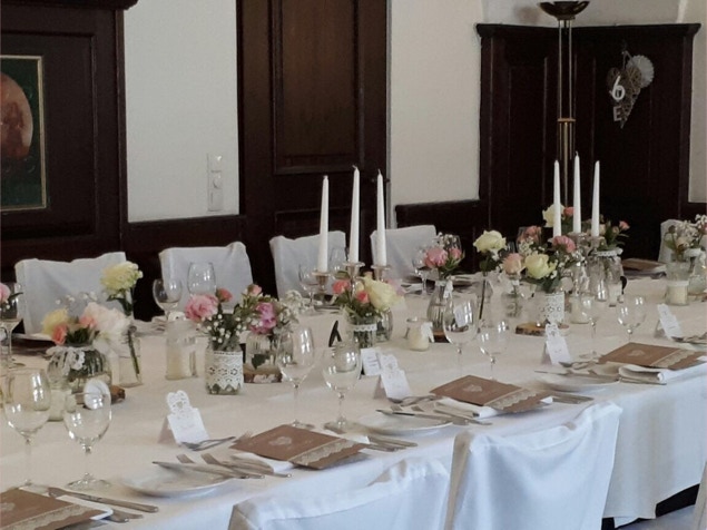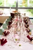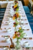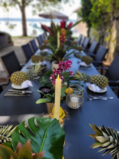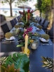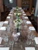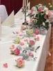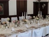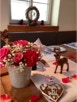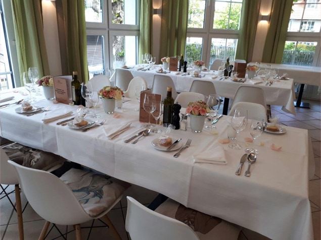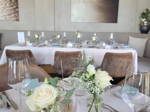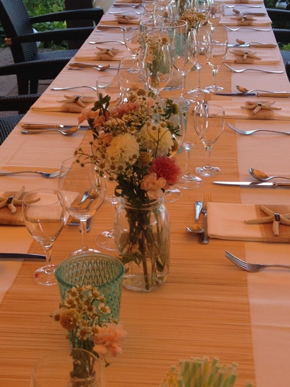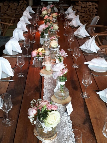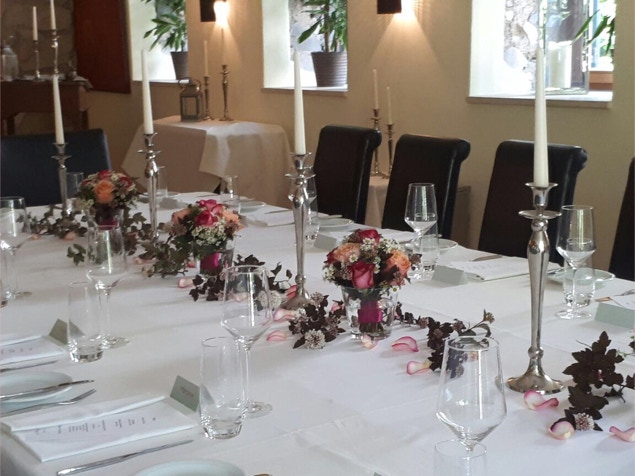 Bei einer länglichen Tafel bietet sich auch ein schmales und längliches Tischgesteck an.